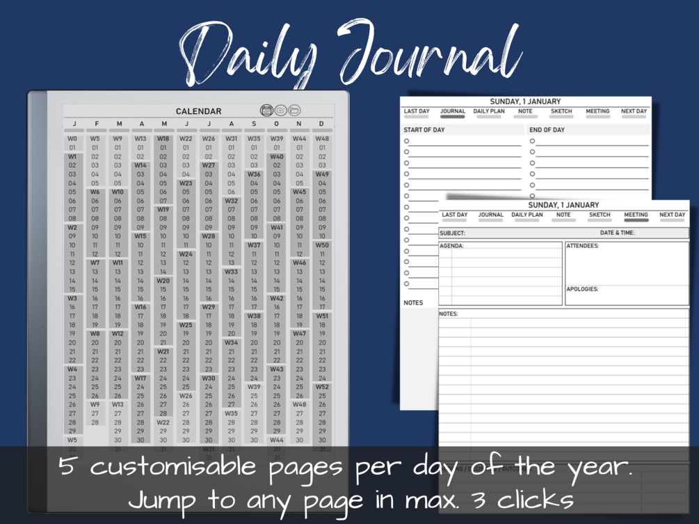 > Daily Journal: Five dot-grid page for each day of 2023; navigate to any page in max 2 clicks